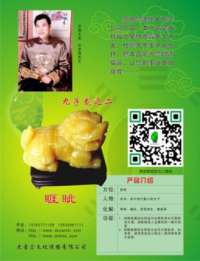 睚眥,是老二,平生好斗喜殺,刀環(huán)、刀柄、龍吞口便是它的遺像。這些武器裝飾了龍的形象后,更增添了懾人的力量。它不僅裝飾在沙場(chǎng)名將的兵器上,更大量地用在儀仗和宮殿守衛者武器上,從而更顯得威嚴莊重。在大玄空風(fēng)水上是可以催武貴、催偏財,運用布局可顯神奇效果。