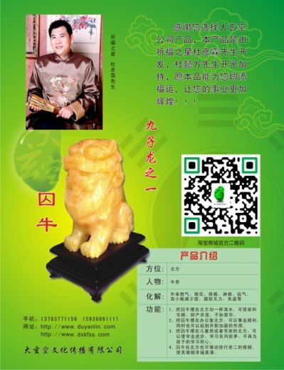 囚牛,是龍生九子中的老大,平生愛(ài)好音樂(lè ),它常常蹲在琴頭上欣賞彈撥弦拉的音樂(lè ),因此琴頭上便刻著(zhù)它的遺像。這個(gè)裝飾現在一直沿用下來(lái),一些貴重的胡琴頭部至今仍刻有龍頭的形象,稱(chēng)其為“龍頭胡琴”。在大玄空風(fēng)水上是可以崔文貴,可以使學(xué)生學(xué)習向上名列前茅,可把他放在流年挨星的一白、四綠、六白方,放二黑、五黃方可以起到化煞之功效。